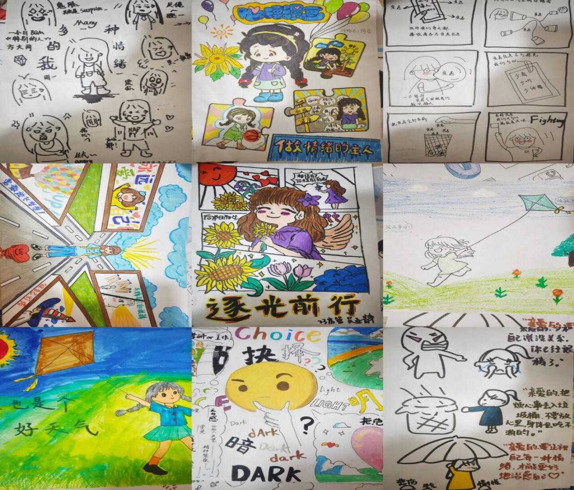 活动以“用色彩释放情绪,用画笔治愈心灵”为主题,通过绘画与日记相结合的形式引导同学们觉察、表达内心的情感。活动启动后,同学们纷纷利用课后闲暇时光,拿起画笔,将内心的情感与思绪倾注于画纸之上。无需复杂的构图,也无需精湛的技艺,每一笔线条、每一种色彩都是他们当下情绪的真实写照。有的同学用明亮的色调勾勒出春天放风筝的欢快景象,有的则以细腻的笔触描绘出自己目前生活中所遇到到一些抉择,有些则用深沉的色彩描述目前他们暂时的烦恼与困惑。