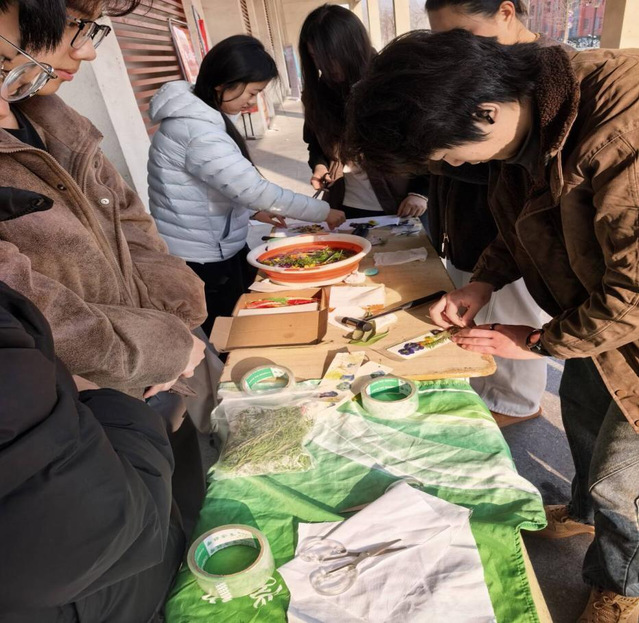 为弘扬植绿、护绿、爱绿的生态文明理念,引导同学们亲近自然、践行环保理念,我院于2026年3月11日在三食堂门口开展“绿意指尖,植染春光”植物拓印主题活动。