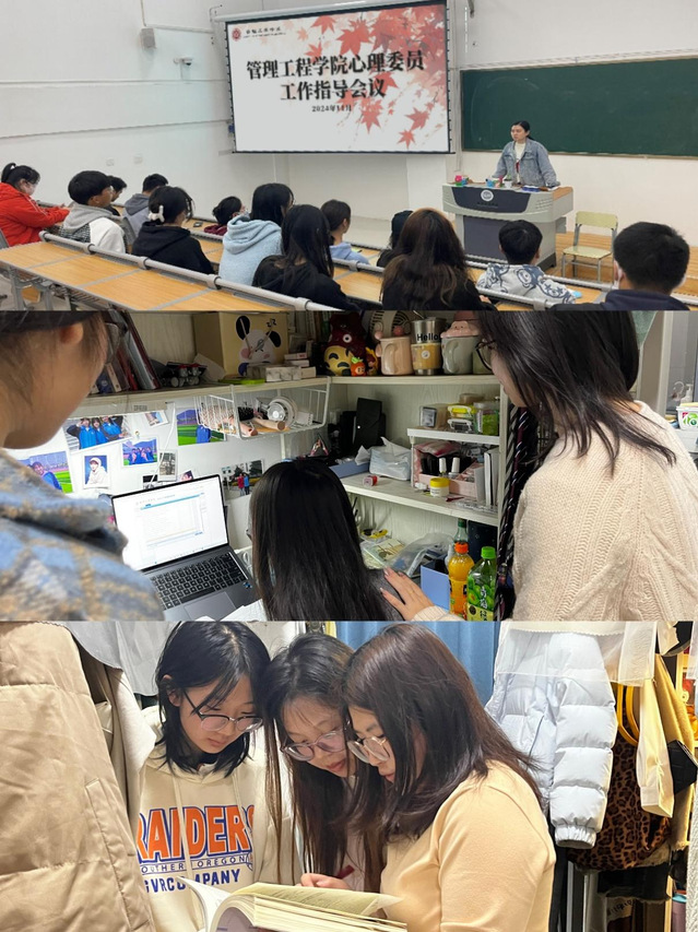 在本次会议中,首先由大一各班心委依次汇报团辅活动的开展情况,田老师对此进行总结与评价。然后各班心委相互交流在日常生活中帮助班级同学的方法,相互交流经验。最后,老师介绍了我们本次会议的主要任务是让心理健康“走进寝室,走入生活”,督促各班心委在未来要经常走访宿舍,通过日常寝室走访,观察同学们的生活习惯,情绪变化等细节,能够及时发现潜在的心理问题,并以真诚的沟通和恰当的关怀为同学们排忧解难。